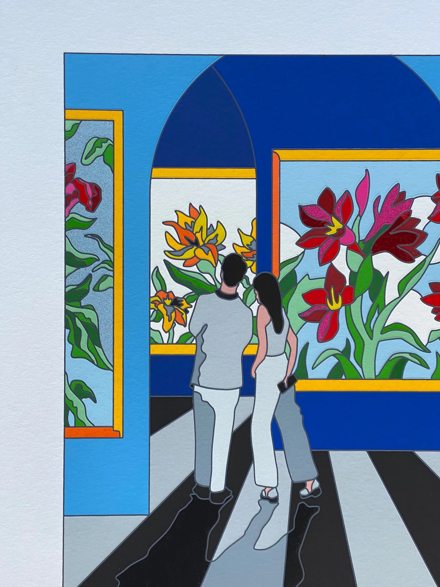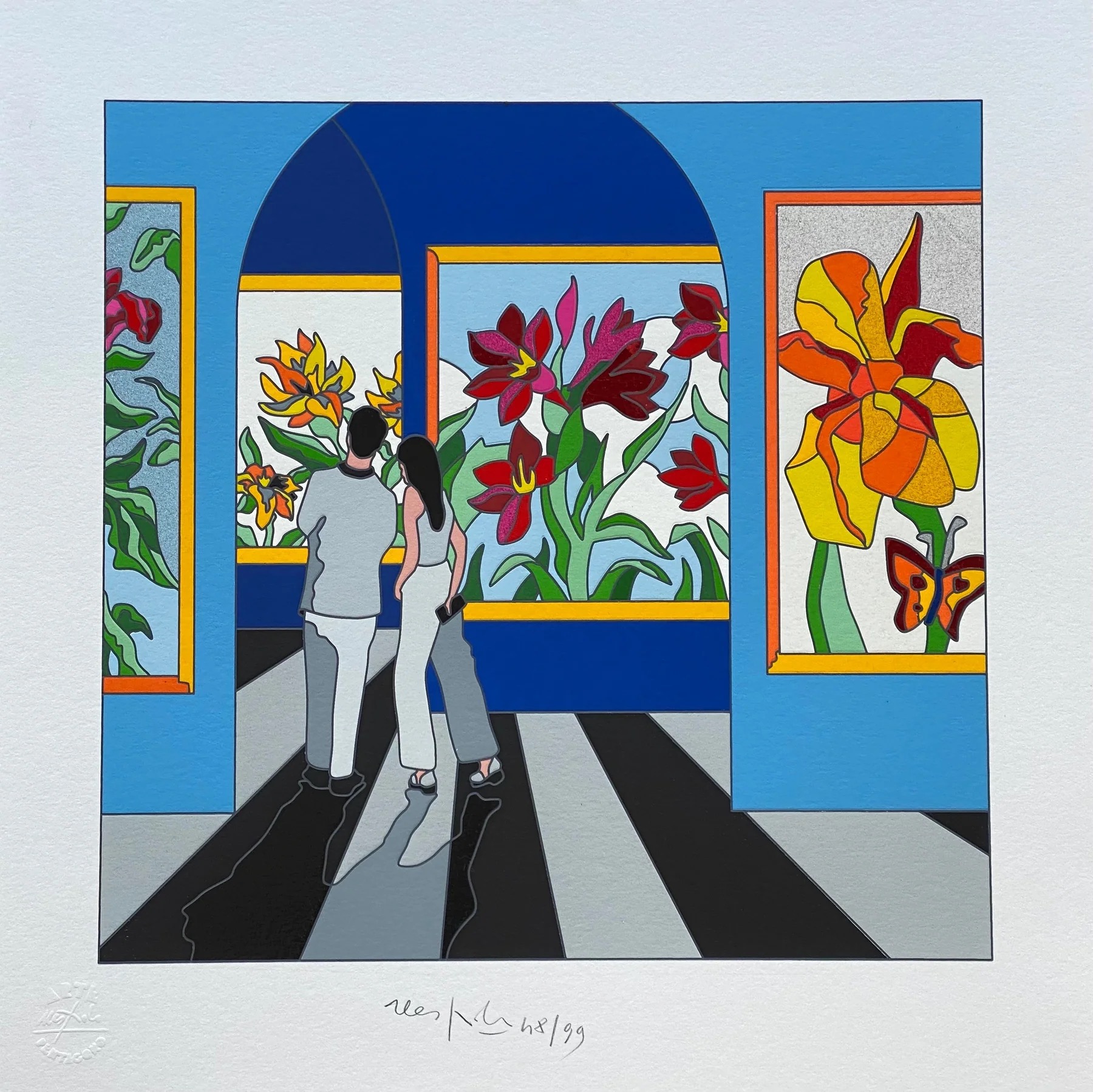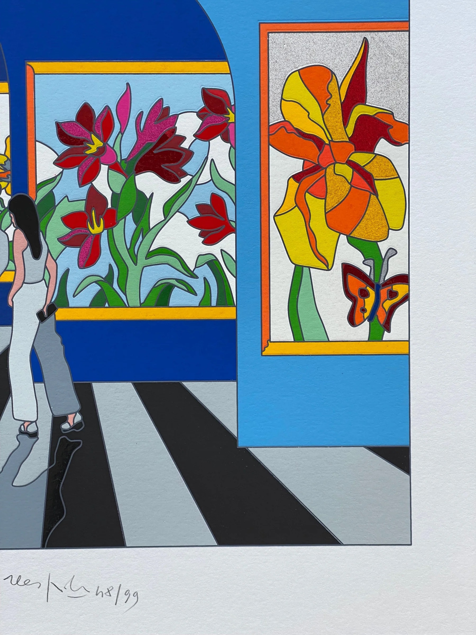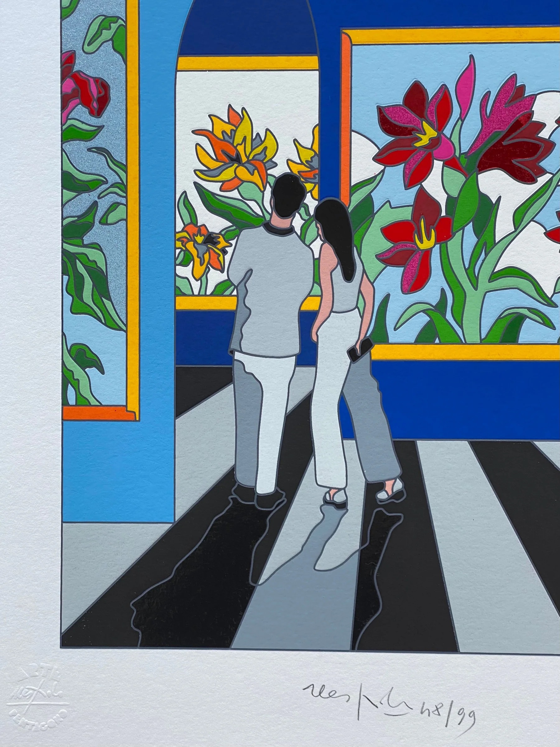 Serigrafia in edizione limitata realizzata interamente a mano a 46 passaggi di colore con interventi in carborundum, floccaggi, foglia oro e passaggio calcografico a secco.