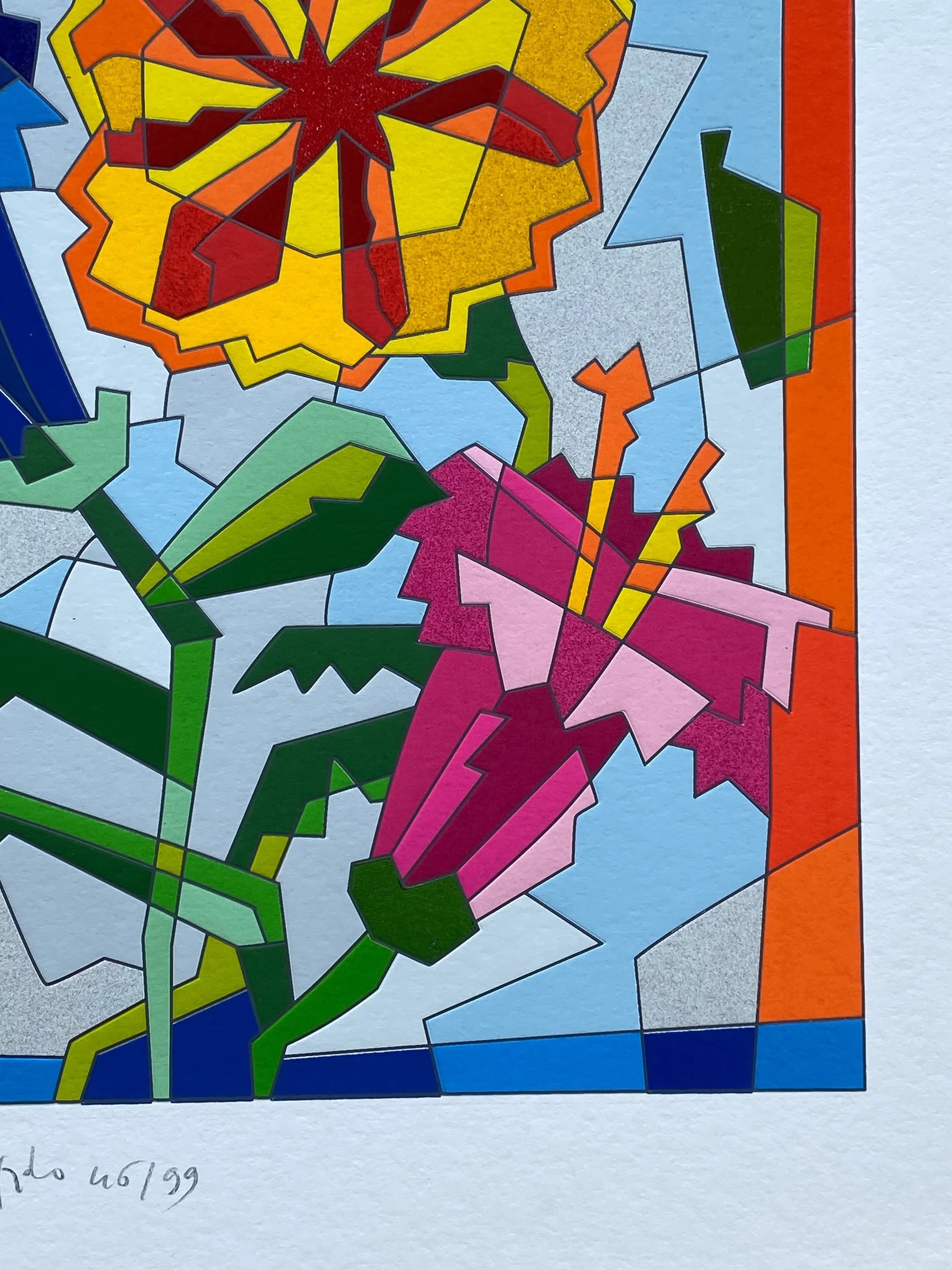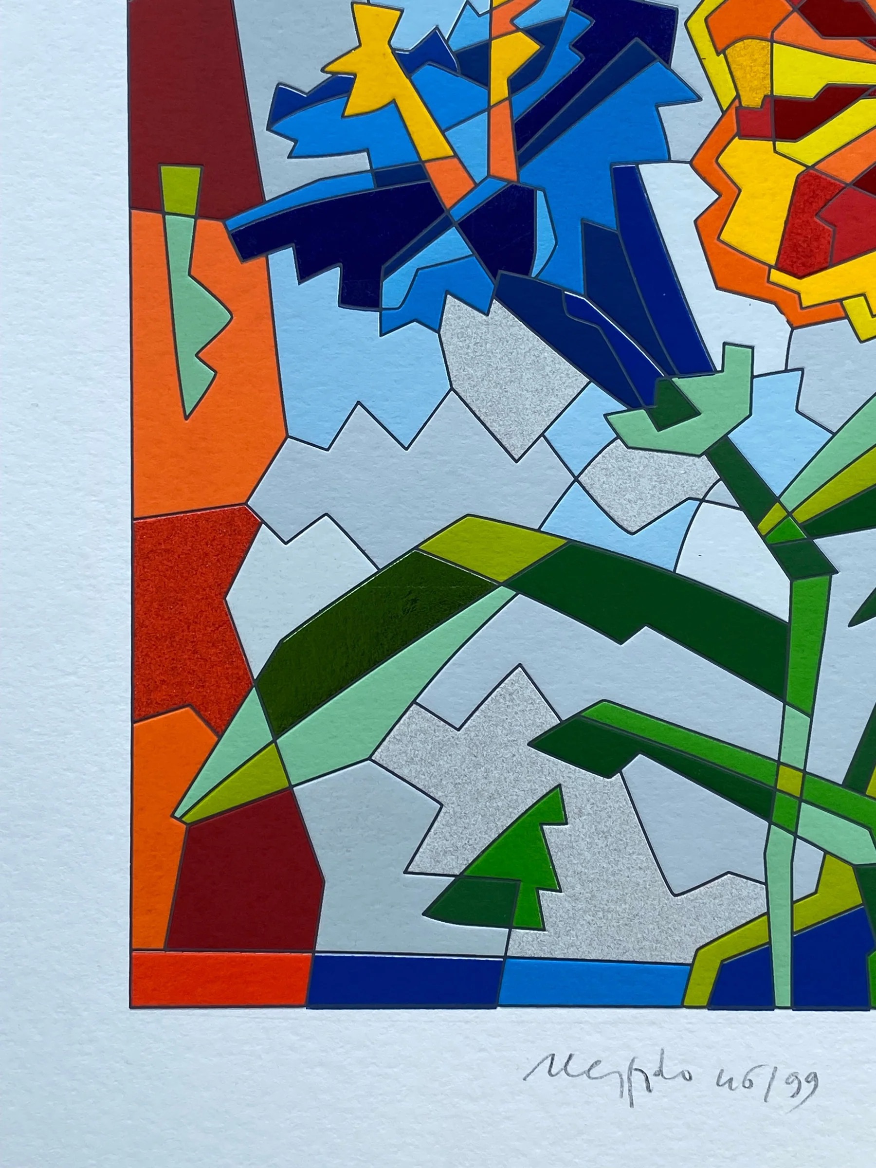 Serigrafia in edizione limitata realizzata interamente a mano a 46 passaggi di colore con interventi in carborundum, floccaggi, foglia oro e passaggio calcografico a secco.